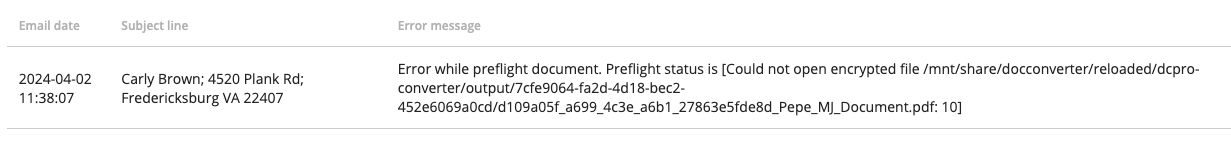 Corrective action: Remove the encryption / password protection from the document. Resend the email to mail message to the appropriate mailbox.